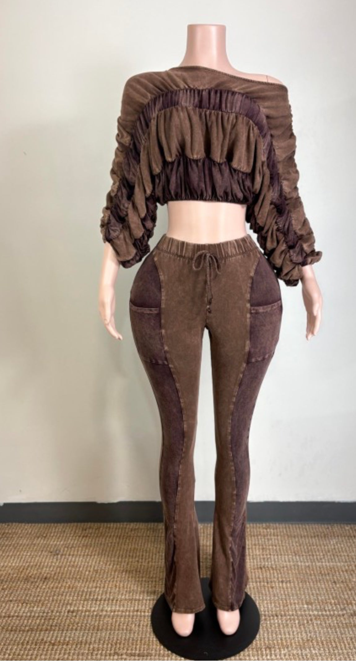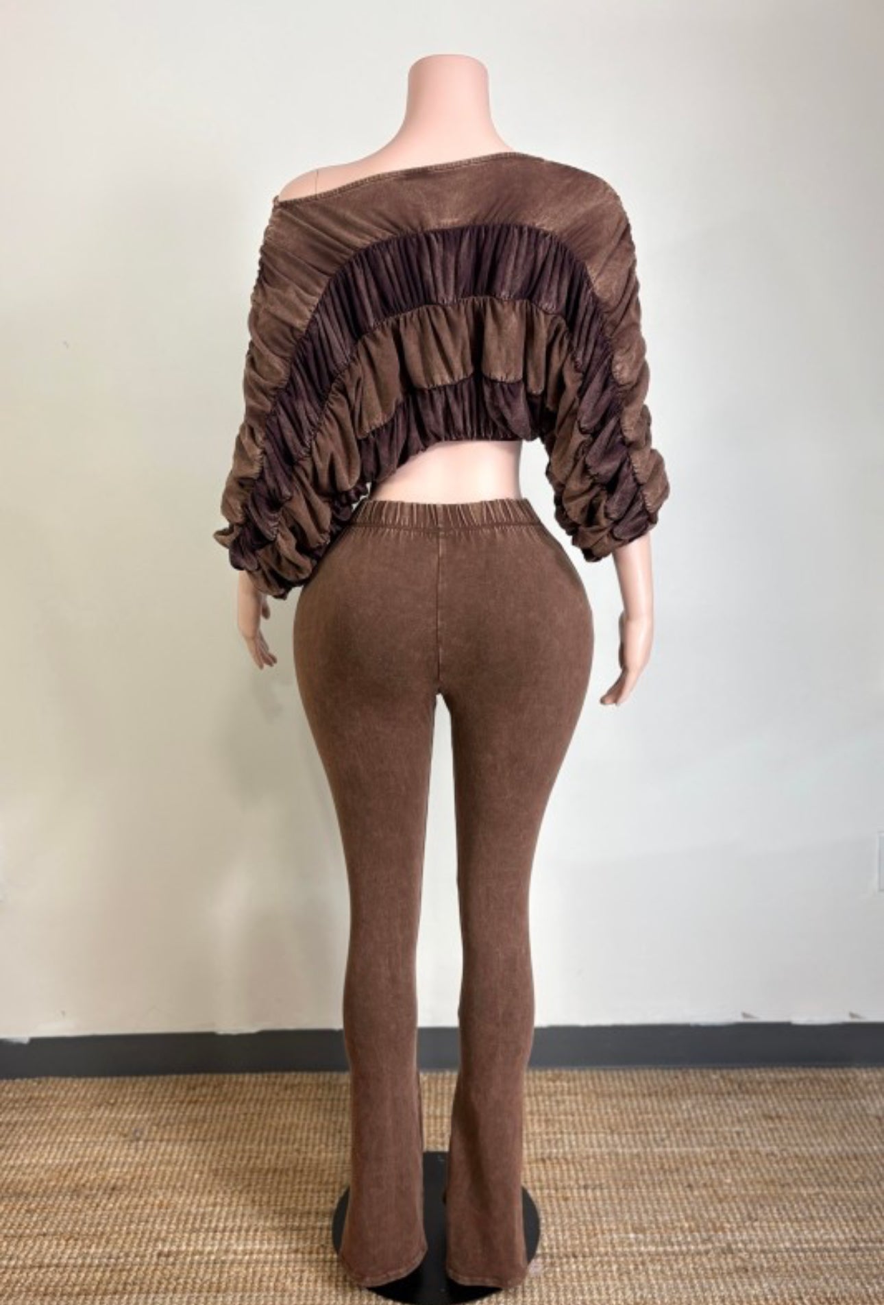 This set features a ruched off-shoulder crop top and matching high-waist flare pants in a rich mocha tone — perfect for date nights, brunch, or fall outings. The stretch velour fabric hugs your shape while keeping you soft and stylish all season long.