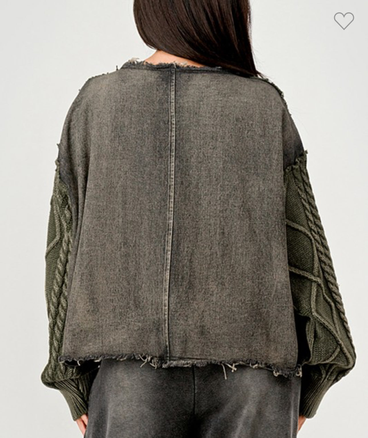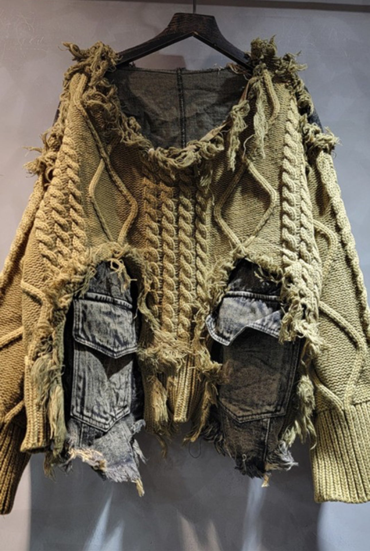 The Distressed Denim Patch Sweater is where cozy meets edgy. This designer-inspired knit combines chunky cable textures, frayed edges, and denim pocket details for a one-of-a-kind street-luxury vibe.